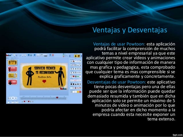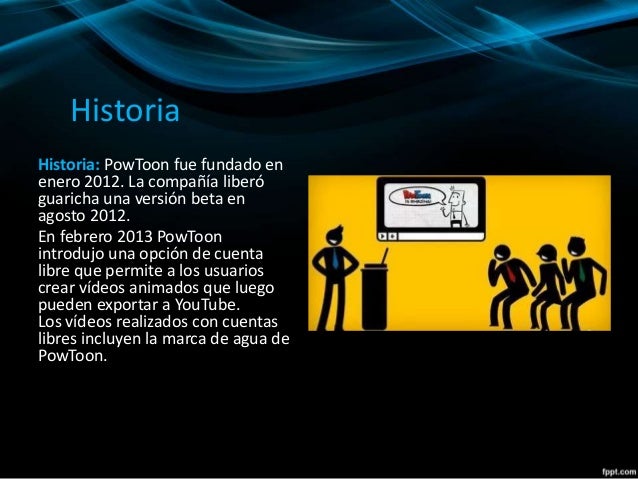 *QUÉ ES? PowToon es un software en línea que tiene como función crear vídeos y presentaciones animadas e interpretar lo que el usuario introduce en su interfaz, reproduciéndose en una especie de caricatura, de una persona hablando mostrando cuadros de diálogo que el usuario haya escrito. Es muy usado en el ámbito escolar y también por cibernautas que con vídeos caricaturizados, comunican una idea a un público elegido.
